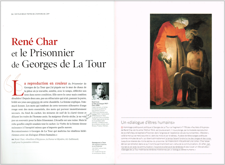 Une double page a particulièrement retenu mon attention : le tableau de Georges de La Tour, Job raillé par sa femme ou Le Prisonnier (vers 1644), auquel répond un texte du poète René Char, tiré de son recueil Fureur et Mystère, titre qui en dit long sur sa date de publication : 1948. Je vous invite à cliquer sur cette image pour vous imprégner du tableau et du texte :
