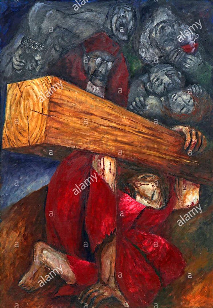 Très affaibli par le manque de sommeil, les événements stressants des dernières heures (Cène, prière d’angoisse à Gethsémani, arrestation, interrogatoires, sentence de mort) et la brutalité de la flagellation — non seulement douloureuse mais épuisante —, le « Fils de l’Homme » (Mt 9, 6) ne devait plus être de taille, physiquement, à soutenir le poids d’une poutre monstrueusement robuste comme celle que Sieger Köder a représentée ici, équarrie avec précision. Est-il nécessaire de rappeler que Jésus étonnera Pilate par sa mort hâtive (Mc 15, 44), qui le désignera comme le plus faible des hommes?