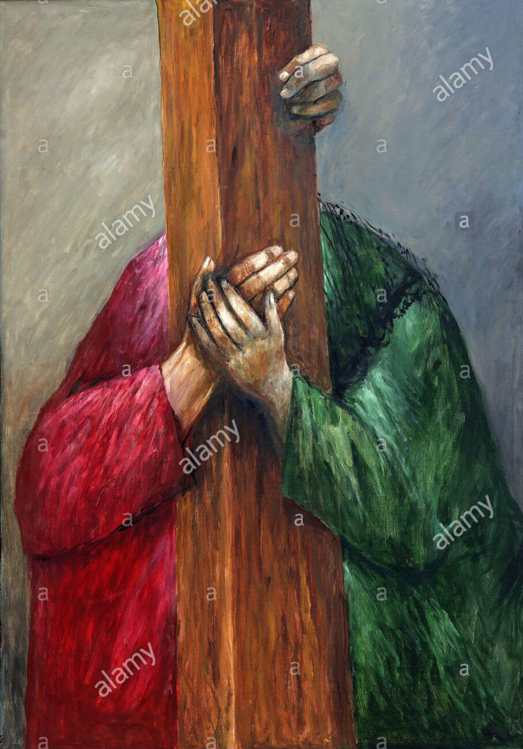 Sieger Köder a caché les visages pour attirer l’attention sur la main de Marie, en plein centre de l’image, tendrement posée sur celle de Jésus. Ensemble, mère et fils, ils forment une seule silhouette porteuse d’un pilier symbolique établi sur terre entre ciel et terre. Dans le mystère de la Rédemption, Marie concélèbre à l’office divin.