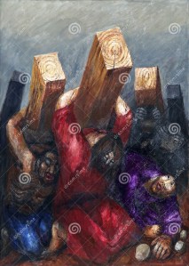 Jésus n’était pas seul à porter l’instrument de son supplice. Deux larrons (des brigands, des voleurs) l’accompagnaient qui portaient leur fardeau, après bien d’autres dont les Évangiles ne parlent pas. Ils ont été innombrables, les condamnés de la Terre (co-damnés, damnés ensemble), et ils le sont toujours. En peignant ce tableau, Sieger Köder pense en filigrane à tous les malheureux qui portent une peine. D’où la présence de ces deux poutres noires qu’il place de part et d’autre de la scène où Jésus, en rouge, est lui-même encadré de ses compagnons d’infortune, en mauve (nuance du violet).
