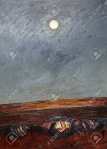 Au soleil blafard qui domine la scène (l’œil du Père?), au centre, répond sur le même axe vertical le visage blême de Jésus, dont l’apparent sommeil est presque déjà celui de la mort. Le bleu que le peintre a jusqu’ici associé à la souffrance et à la mort, il en remplit le ciel nuageux. Cette masse vide mais chargée pèse de tout son poids sur Jésus, à terre.