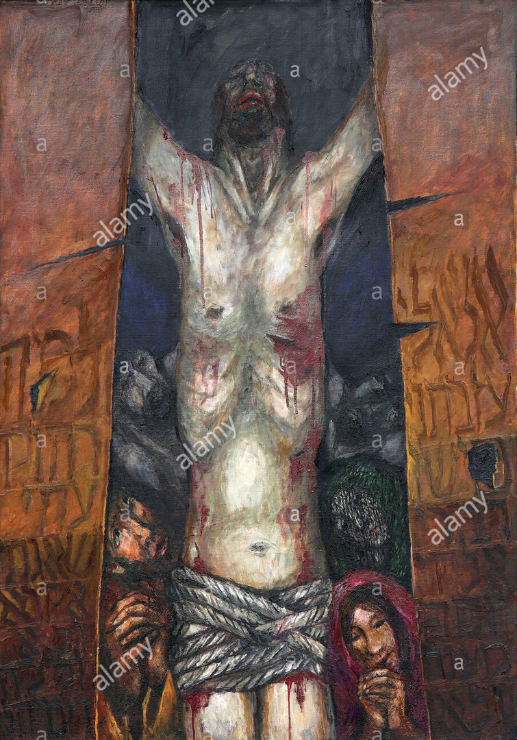D’abord, Köder fait l’économie de la croix. Jésus paraît suspendu dans le vide, le tronc étiré, le bas-ventre noué de cordages entrelacés. (Pudeur oblige? Il aurait pu dessiner un voile; il a choisi de grosses cordes, de celles dont on se sert pour immobiliser et non dissimuler quelque chose.)