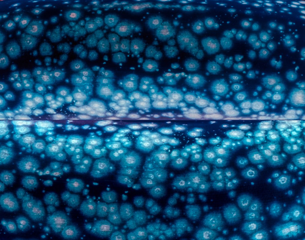 Vous la connaissez déjà, mais vous ne savez peut-être pas qu’il s’agit en réalité du montage en miroir de deux gros plans de pelure de banane… dont j’ai modifié les couleurs! Voici les « Méduses galactiques ».