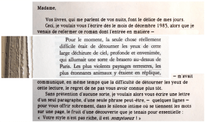 Trente-huit ans après ma première lecture, il ne m’a pas semblé relire le même livre. Nous avons vieilli, mon exemplaire et moi. Il est vrai qu’on ne « lit » jamais que ce qu’on est en mesure de décoder. J’avais été ému par la beauté du style, de cela, je me souvenais, pas de la trame narrative. Je ne me souvenais pas que l’autrice désirait nous servir un avertissement : attention aux hommes contrôlants. Ils sont pareils à des trous noirs. S’en approche-t-on de trop près, ils nous aspirent et nous disloquent. C’est ce que je n’avais pas compris en adressant la lettre suivante à l’attention de « Madame Raphaële Billetdoux » le 15 mars 1988.