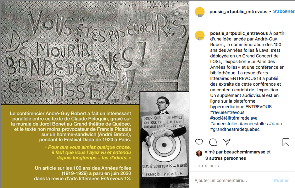 - Trois images illustrant les productions de la SLL pour le centenaire du Paris des Années folles : deux présentoirs, une conférence et une section spéciale d’Entrevous. Si vous avez un compte Instagram, vous retrouverez ces images et en découvrirez d’autres dans la galerie poesie_artpublic_entrevous de la SLL, que je vous invite à explorer.