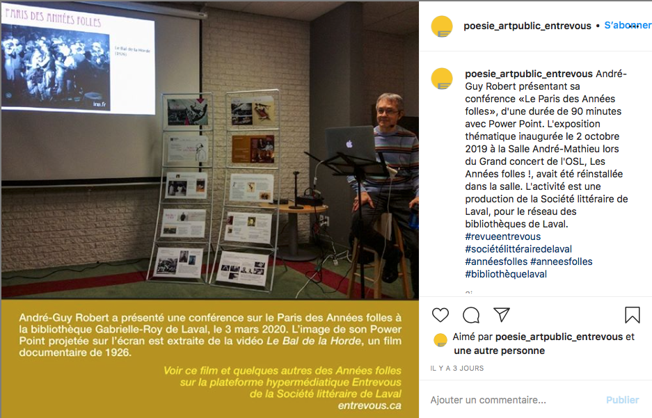 Le Paris des Années folles (1919-1929) : conférence donnée le 3 mars 2020 à la bibliothèque Gabrielle-Roy de Laval (Québec) pour commémorer le centenaire d’une décennie parisienne culturellement remarquable qui a eu des échos jusqu’au Québec. Communiqué. Présentation [sur Facebook]
