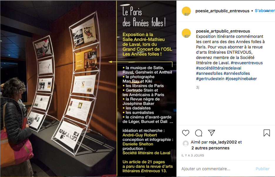 - Le Paris des Années folles, une section de 21 pages du numéro 13 (juin 2020) de la revue Entrevous que je reproduis ici, avec l’autorisation de la directrice. Il s’agit d’une version revue et augmentée des 10 affichettes que la Société littéraire de Laval a exposées sur deux présentoirs au foyer du théâtre André-Mathieu lors du Grand Concert Les Années folles donné le 2 octobre 2019 par l’Orchestre symphonique de Laval.