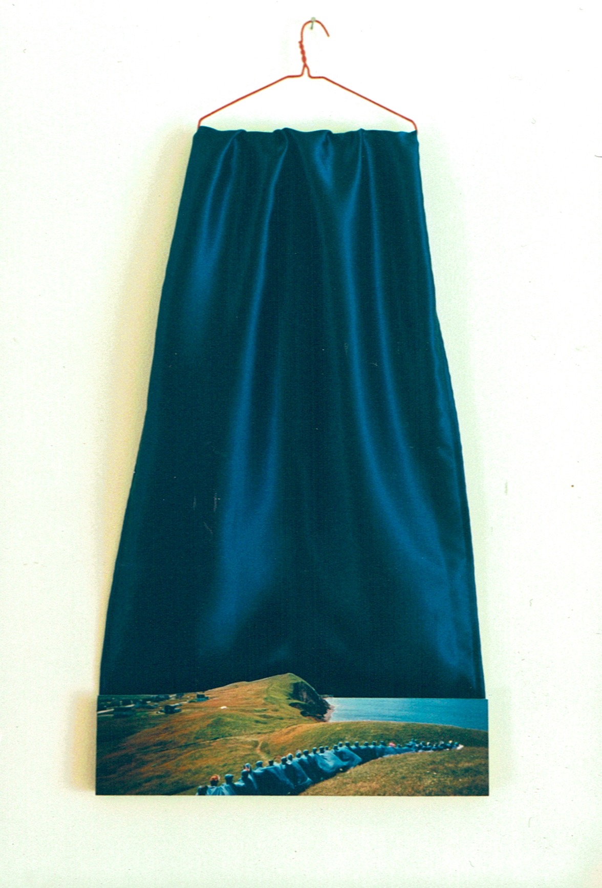 - En 1999, j’ai assisté à un événement remarquable aux Îles-de-la-Madeleine : « la Chenille ». C’était vraiment quelque chose de voir une trentaine de personnes, portant un seul grand costume, défiler à la queue leu leu sur les collines dénudées, avec la mer en fond de scène! En 2001, j’ai taillé ma photo panoramique et l’ai suspendue, littéralement, à un ciel de soie bleue… Cette installation surréaliste m’amuse encore!